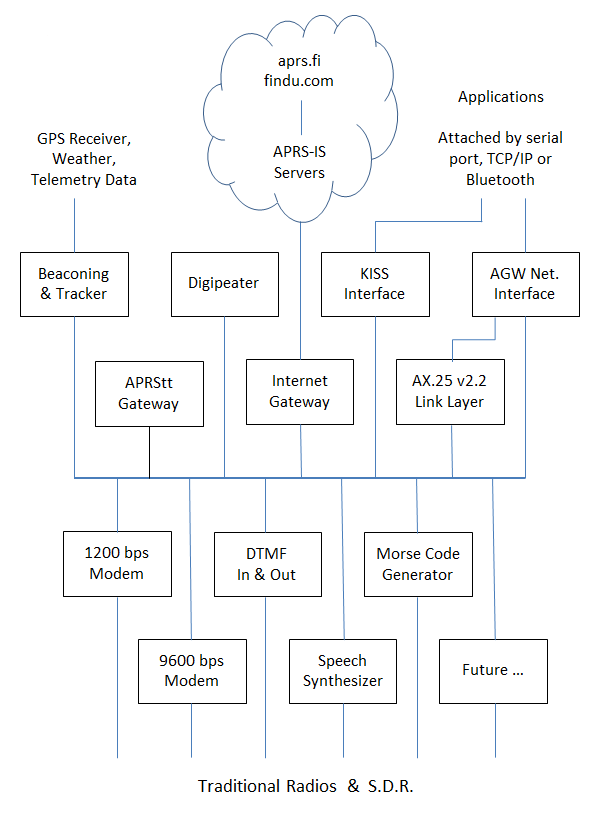 • KISS Interface (TCP/IP, serial port, Bluetooth) & AGW network Interface (TCP/IP).